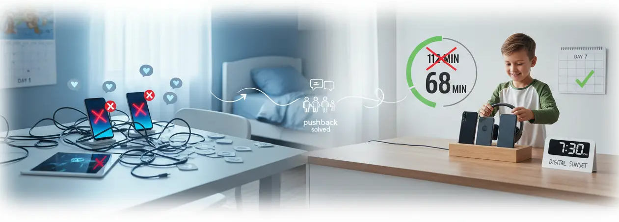 You're willing to make environmental changes (like moving devices out of bedrooms, setting up charging stations, and adjusting device settings)... you understand this isn't just about "trying harder" but changing the system